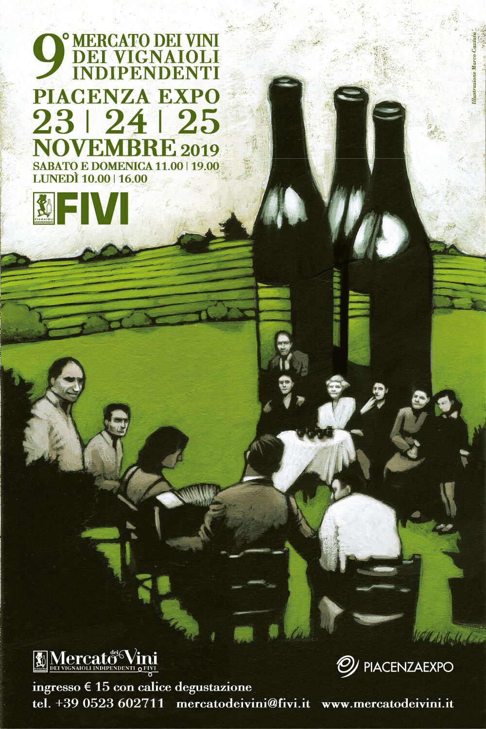 L’immagine della locandina della nona edizione è stata disegnata da Marco Cazzato, già autore nel 2013 della prima immagine illustrata del Mercato. Cazzato, classe 1975, torinese di adozione, è un noto illustratore dalla forte identità. È autore di libri, album e manifesti per numerosi eventi e vanta diverse collaborazioni in ambito musicale e cinematografico. “Questa illustrazione – dichiara Cazzato – è nata con l’idea di raccontare ciò che il Mercato rappresenta per me: il rapporto con la natura e il territorio dove il vignaiolo lavora e dal quale riesce a cogliere ogni sfumatura condensandola nei suoi vini. Ma vuole rappresentare anche il Mercato inteso come festa e lo spirito stesso che la anima”.