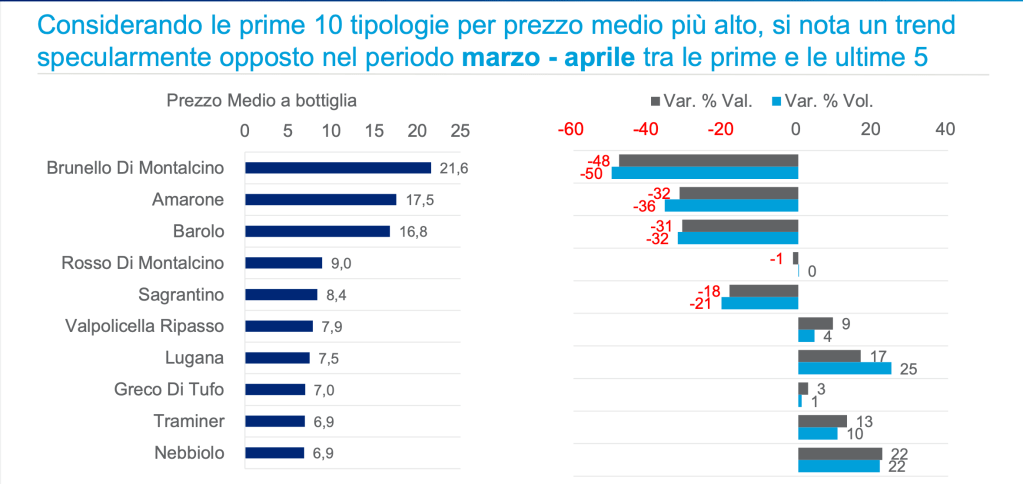 la convenienza. Aumentano i vini di qualità a denominazione d’origine, ma nel contempo anche il vino comune da tavola, dunque una forchetta che privilegia fasce alte e basse. Infine, nei primi 10 mesi del 2020 sono aumentate del 122% le vendite di vino on line e del 200% quelle dei grocery di piccole dimensioni.