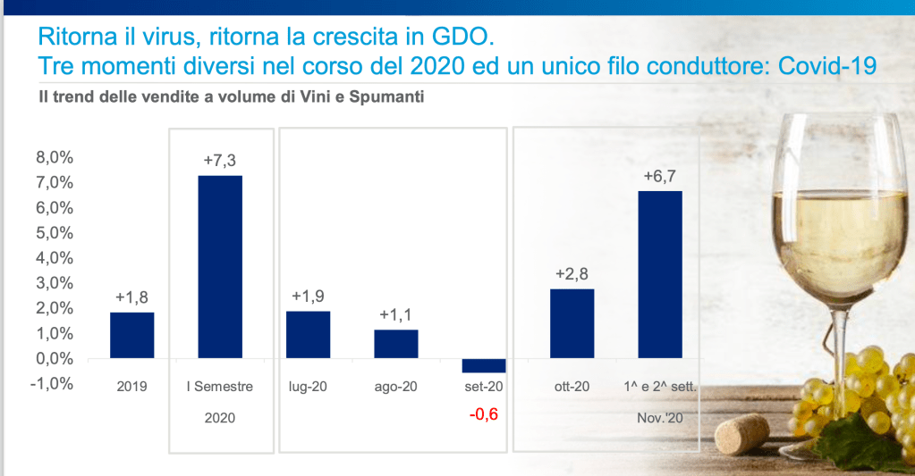L’analisi dell’IRI evidenzia come lo sviluppo del mercato del vino nella Gdo si realizzi in un contesto di aumento dei prezzi (+1,4%) e di calo delle promozioni (-3%). L’elemento determinante è stato l’andamento della pandemia. Dopo la stabilizzazione del periodo estivo, le vendite di vino hanno ripreso a correre in coincidenza della seconda ondata: +2,8% in ottobre e +6,7% nelle prime due settimane di novembre.